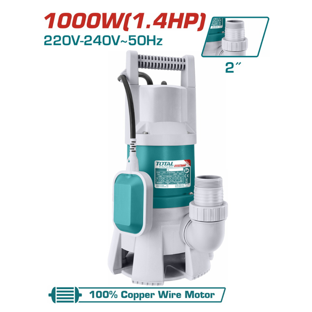 The TOTAL TWP810001 is built for heavy-duty water transfer and drainage tasks. Powered by a 1000W (1.4HP) motor, it delivers reliable pumping performance while maintaining energy efficiency.